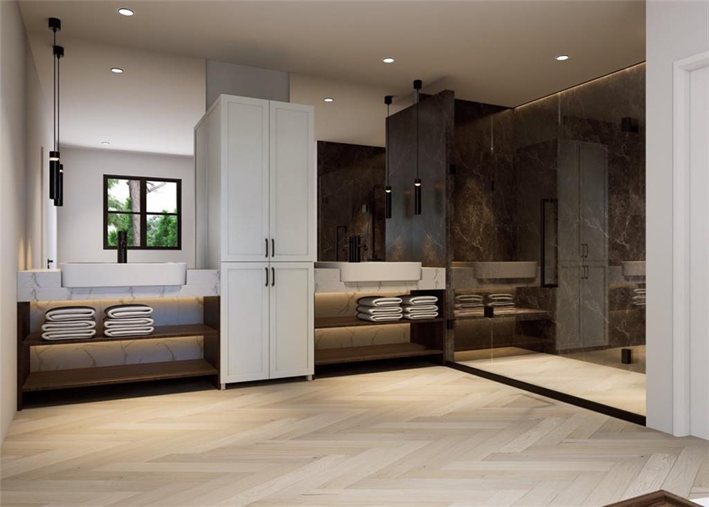 Upstairs, retreat to a luxurious owner’s suite designed as a true sanctuary—complete with generous space, spa-style bath, and walk-in closets. Additional bedrooms are thoughtfully placed, offering comfort and privacy, while the open view below to the great room enhances the home’s airy, grand feel.